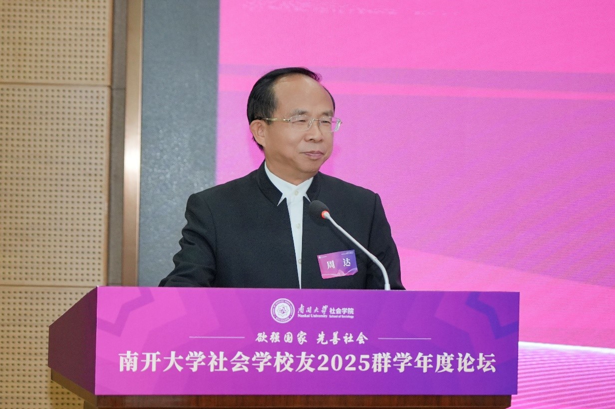 资深校董、南开校友总会社会学分会会长、1987级社会学硕士校友周达致辞。他说,国家之间的竞争归根结底是科技和治理能力结构现代化的竞争。中华民族要实现伟大复兴,离不开治理的现代化,离不开高校的持续性发展。国产自拍